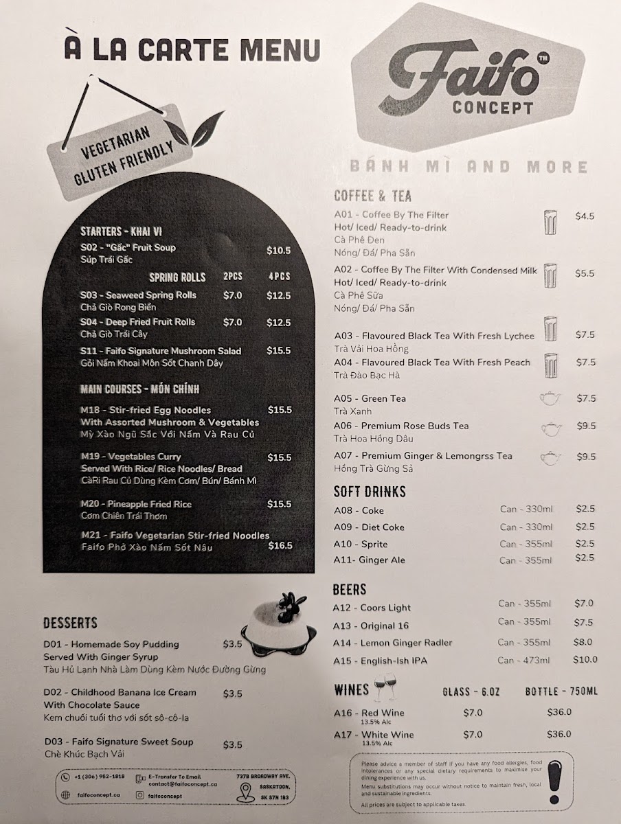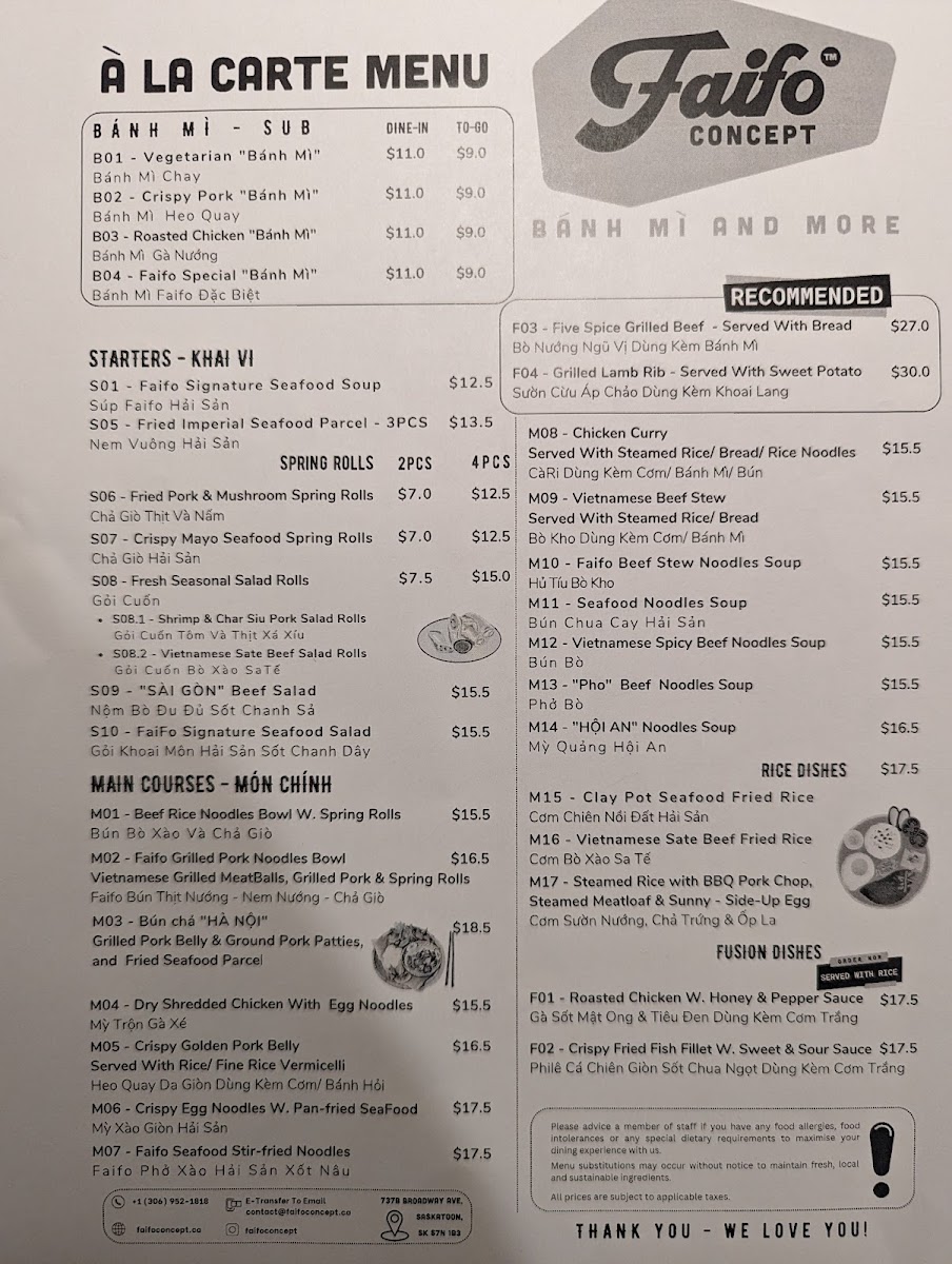 Welcome to FaiFo Concept Canada, a hidden gem located at 737B Broadway Ave, Saskatoon. This vibrant eatery specializes in an array of authentic Vietnamese dishes that will tantalize your taste buds.